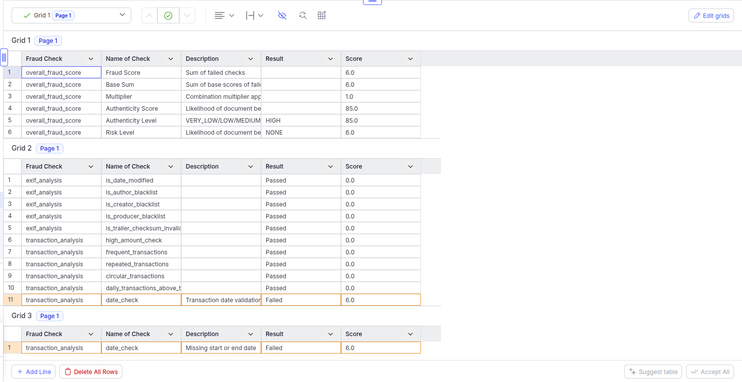 The second grid lists all the fraud checks applied to the bank statement document. It has the broader category of the fraud check, the name of the check, and the result column, where Pass might indicate no signal of fraud, and Failed indicates a probable signal of a specific fraud.
