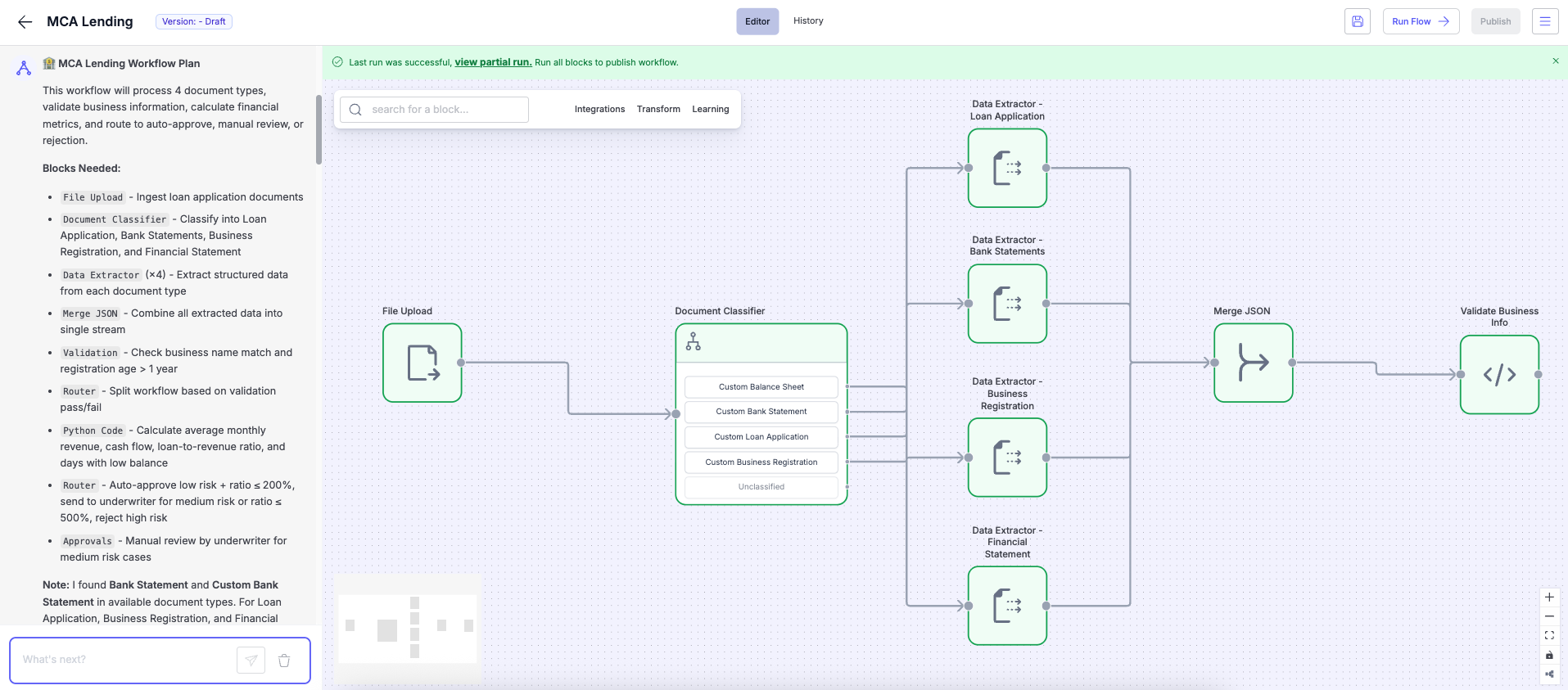 - You can ask it to modify your workflow, run tests, or explain block configurations anytime