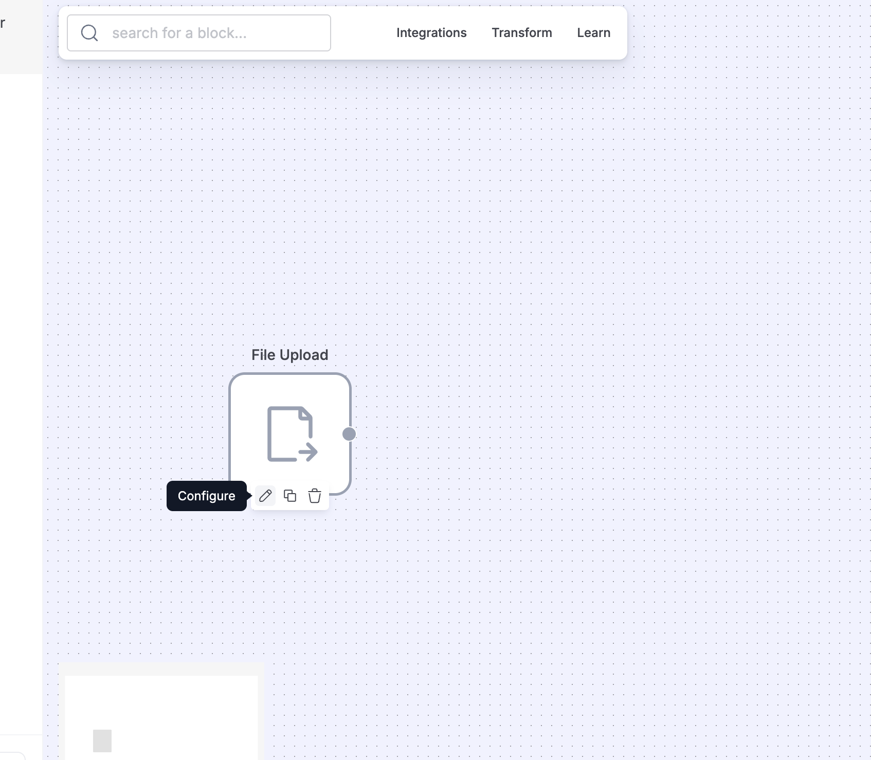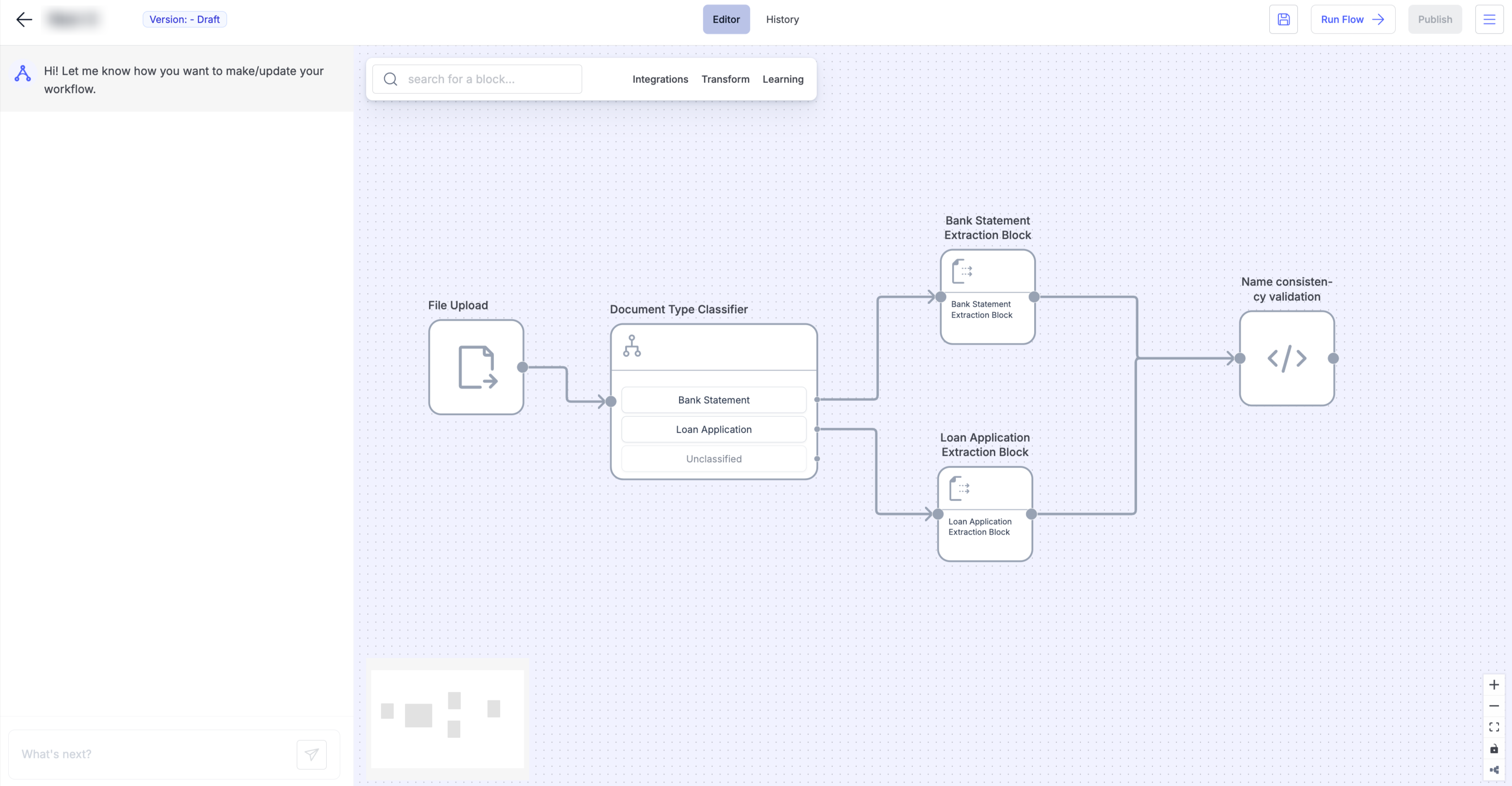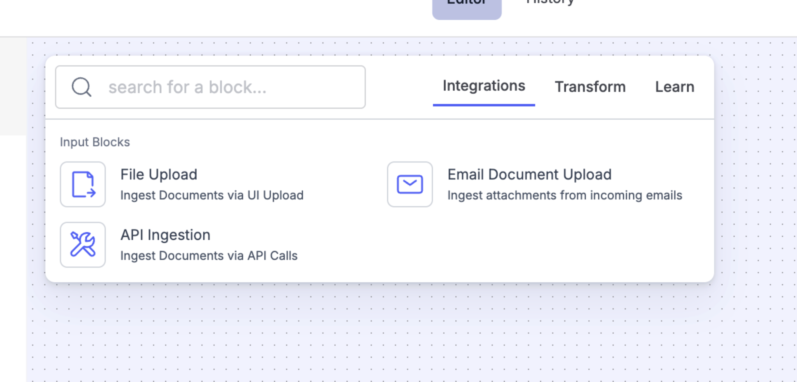 | Block Library Tabs | A categorized list of available blocks to build workflows. | - Integrations: File upload, Email, API ingestion - Transform: Data extraction, Python code, AI categorization - Learn: View examples or help articles |