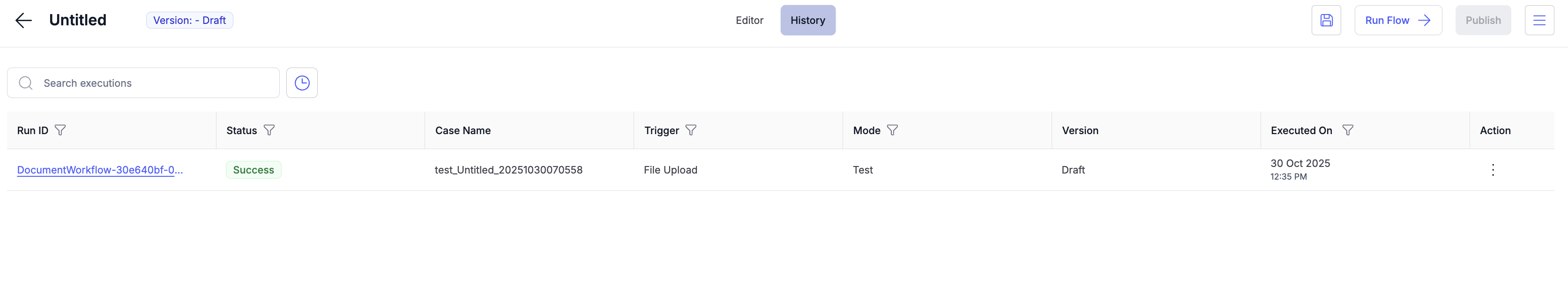 | Top Navigation Bar | Provides quick access to essential controls and tabs. | - Switch between Editor and History - Save, Run Flow, or Publish workflows |